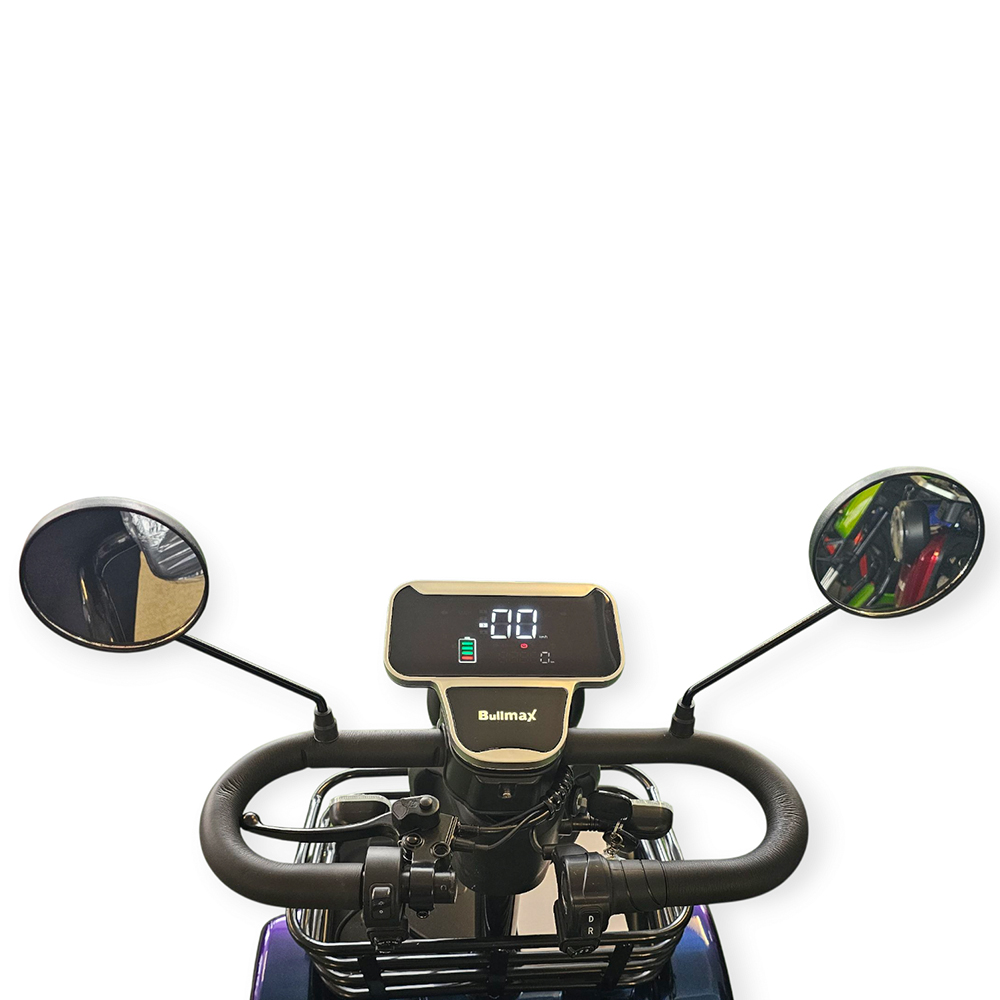 Триместна електрическа четириколка за възрастни и трудноподвижни лица BULLMAX A9, е оборудвана с пълна LED светлинна окомплектовка, голям цветен дисплей. С мощният си двигател 1500W и големите батерии 48V/20Ah може да преодолява наклони до 25°. Перфектният избор на превозно средство да отидете на разходка в парка или до магазина на пазар, има две големи кошници за багаж! Подходяща за възрастни и трудноподвижни хора!